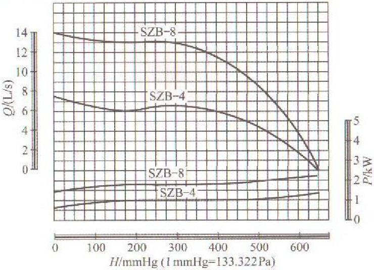 水環(huán)式真空泵有SZB型和SZ型。圖4為SZB型真空泵的性能曲線。表1為SZ型真空泵性能表。